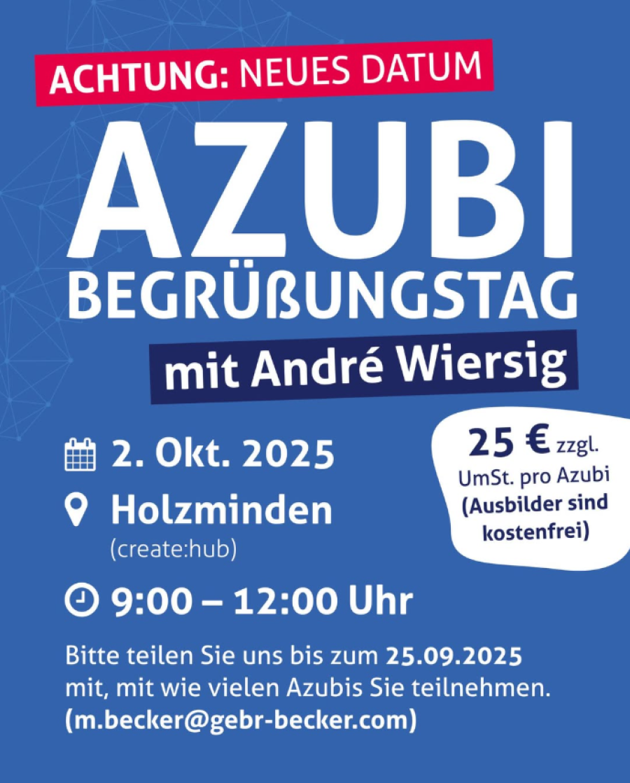 Liebe Mitglieder, aufgrund des kurzfristigen Ausfalls von André Wiersig müssen wir den Azubi-Begrüßungstag verschieben.