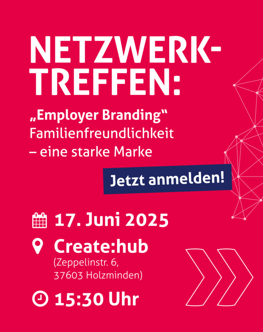 Am 17. Juni laden wir euch zum Netzwerktreffen „Employer Branding – Familienfreundlichkeit: eine starke Marke“ in den create:hub Holzminden ein.